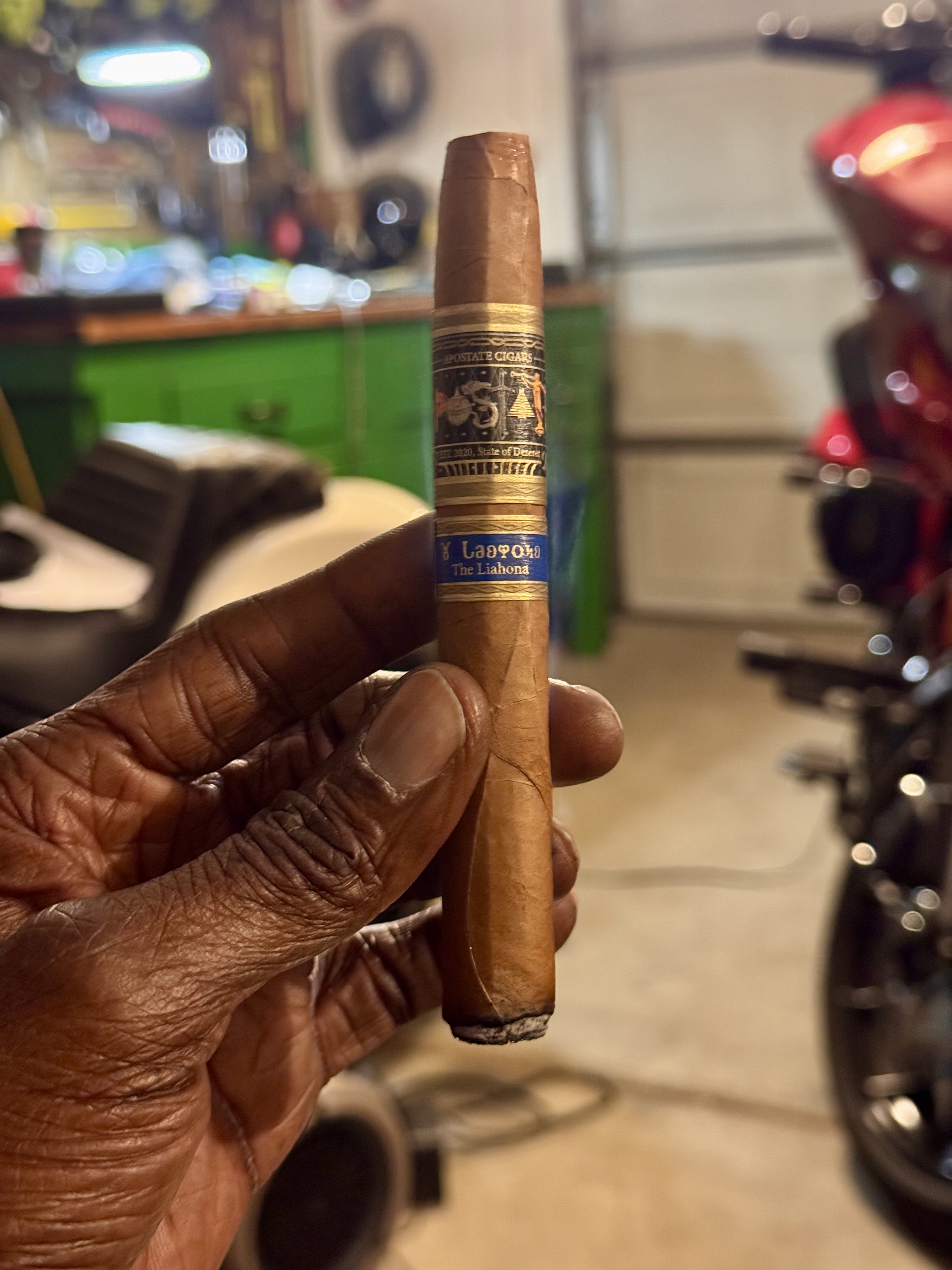The Apostate The Liahona is the lightest of the company's initial three offerings, being rolled in a torpedo shape to tie into the cigar's name (a compass of divine origin in Mormon scripture). Described as "Deceptively rich in flavor," the cigar boasts an Ecuadorian Connecticut wrapper and interior leaves from Mexico, Paraguay, and the Dominican Republic.