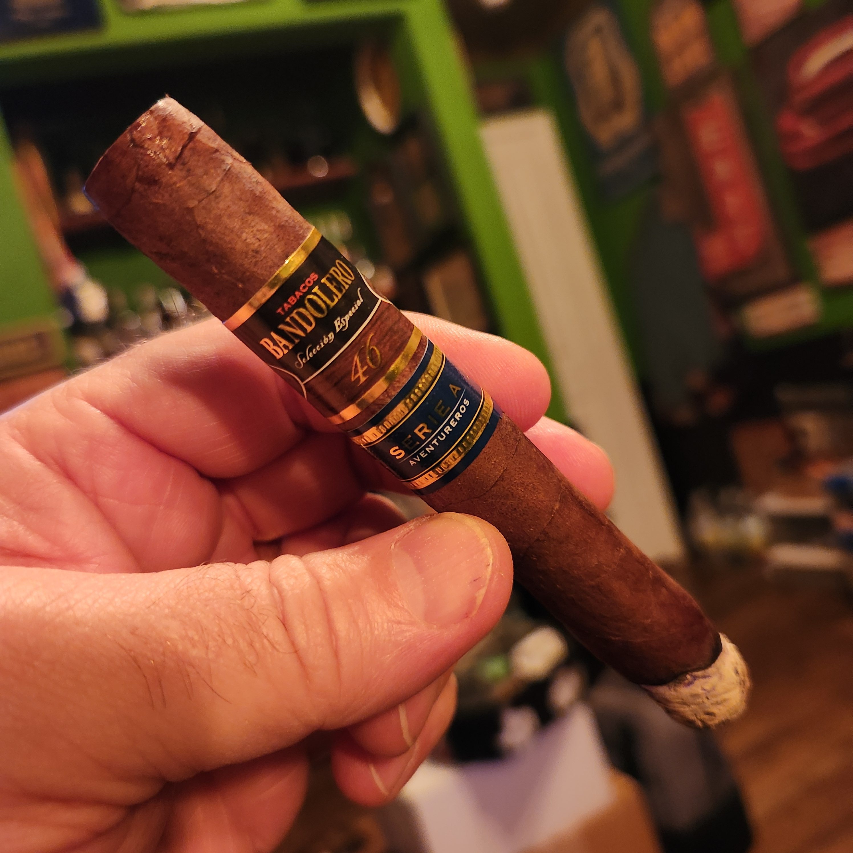 Bandolero Serie A Aventureros is one of three blends within the Bandolero line from Selected Tobacco S.A. The Serie A Aventureros is the darkest of the three, being distinguishable by its dark blue sub-band. With an oily Ecuadorian wrapper, the blend is fuller-bodied, being known to exhibit notes of black pepper, cocoa, and espresso.