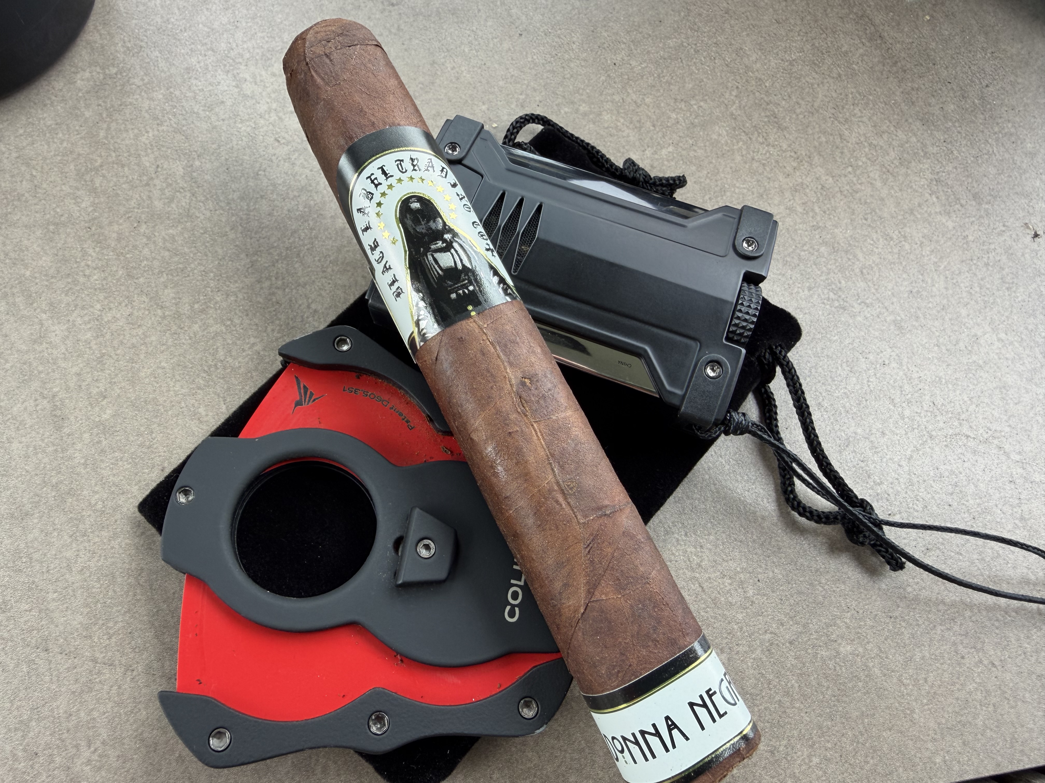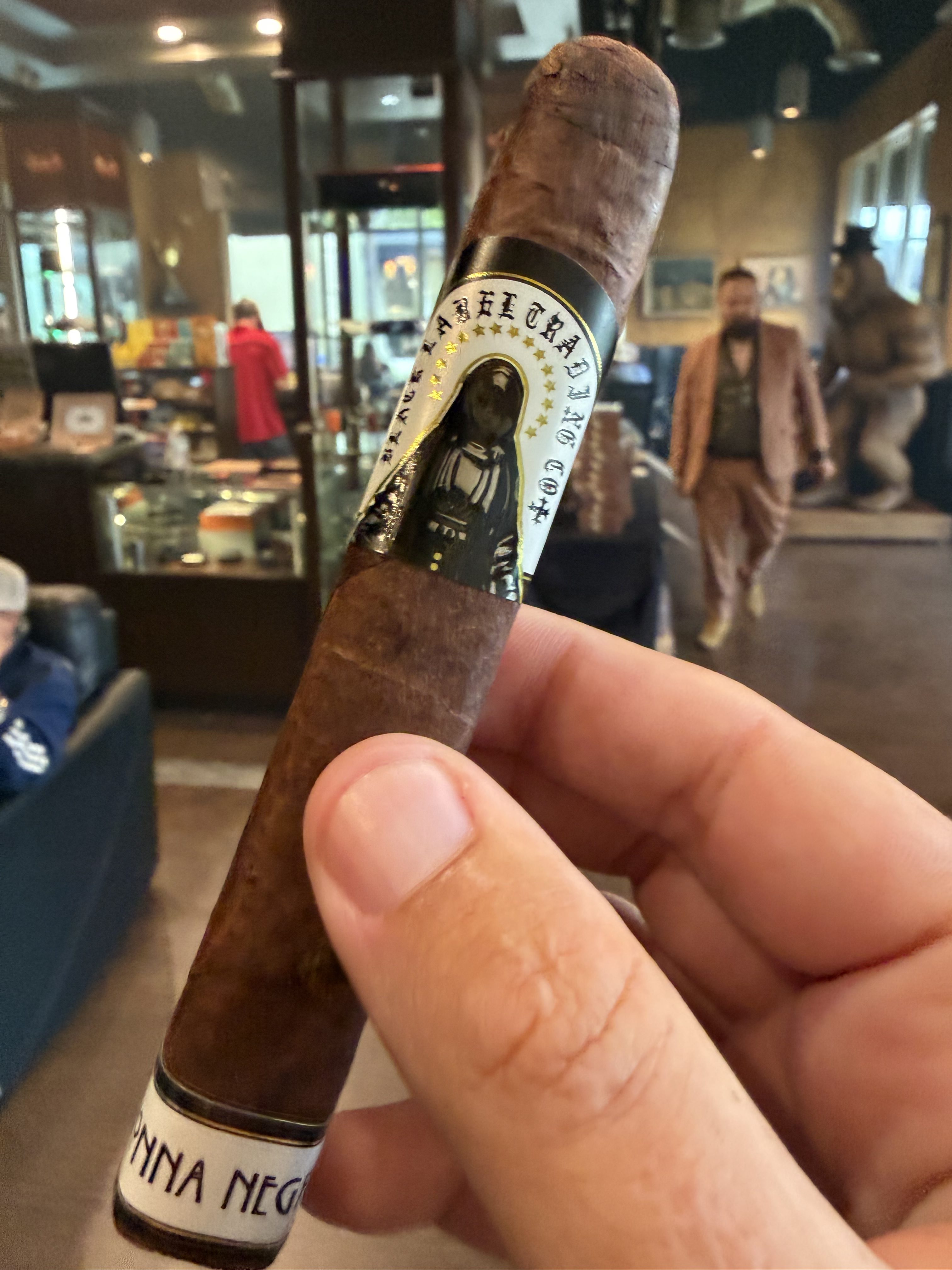 Black Label Trading Company's La Madonna Negra cigar was introduced in 2023 in celebration of the company's milestone 10th anniversary. The blend is described as a culmination of things learned over the last decade of cigarmaking for co-owner/blender James Brown, being bold yet refined and elegant. The recipe begins with a Connecticut Broadleaf wrapper, extending over an Ecuadorian Habano binder and fillers from Nicaragua and Pennsylvania.