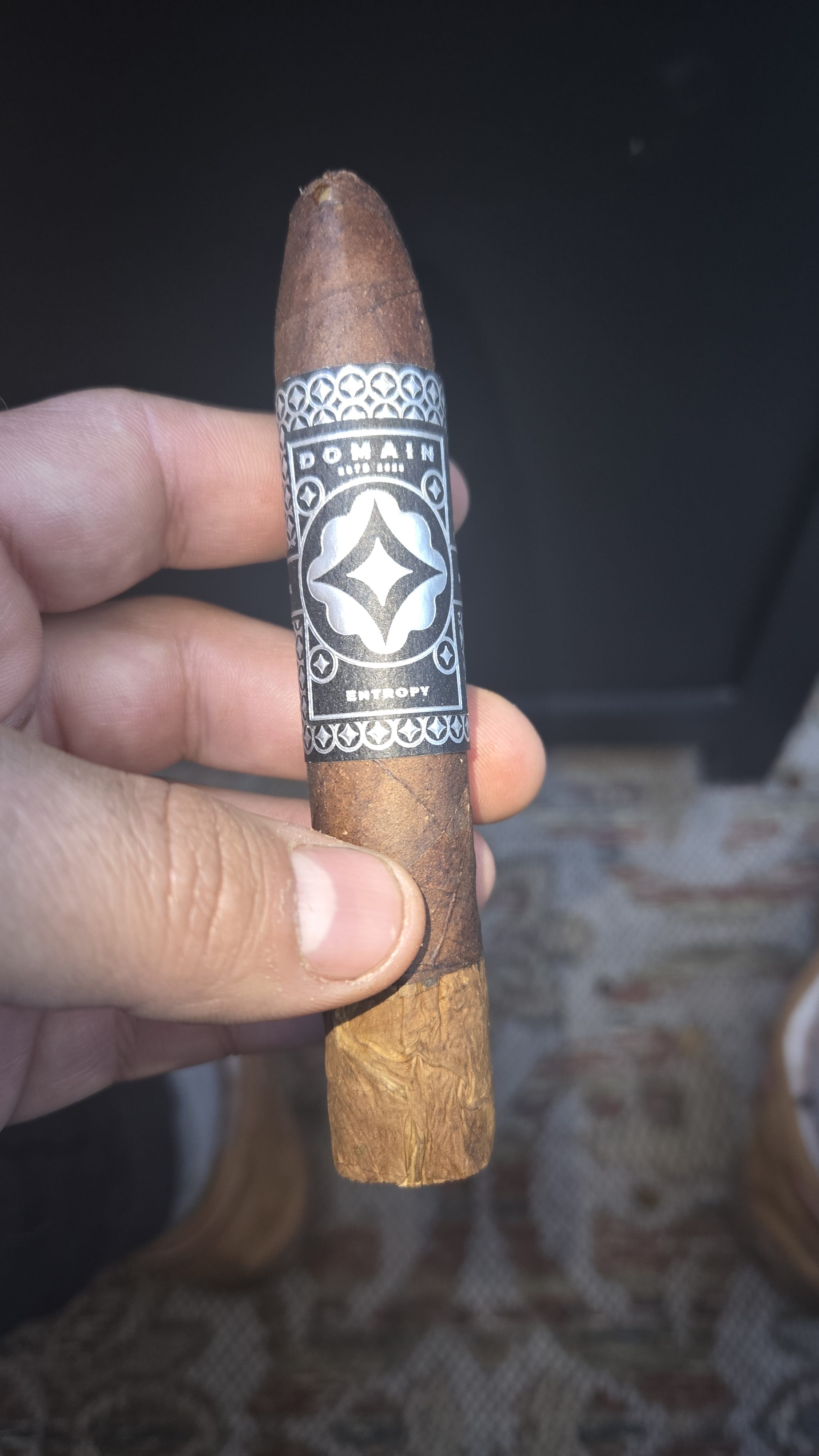 Domain Entropy is the third release from Domain Cigars, said to borrow heavily from the company's former Domain Negentropy line. The blend features a Connecticut Broadleaf wrapper over Nicaraguan binder/filler, leaning heavily on ligero tobacco primings. The cigar was intended to be the debut Domain line, being set back due to the original recipe being lost, leading to the eventual testing of over 6,000 variations in order to retrieve the proper Entropy experience.