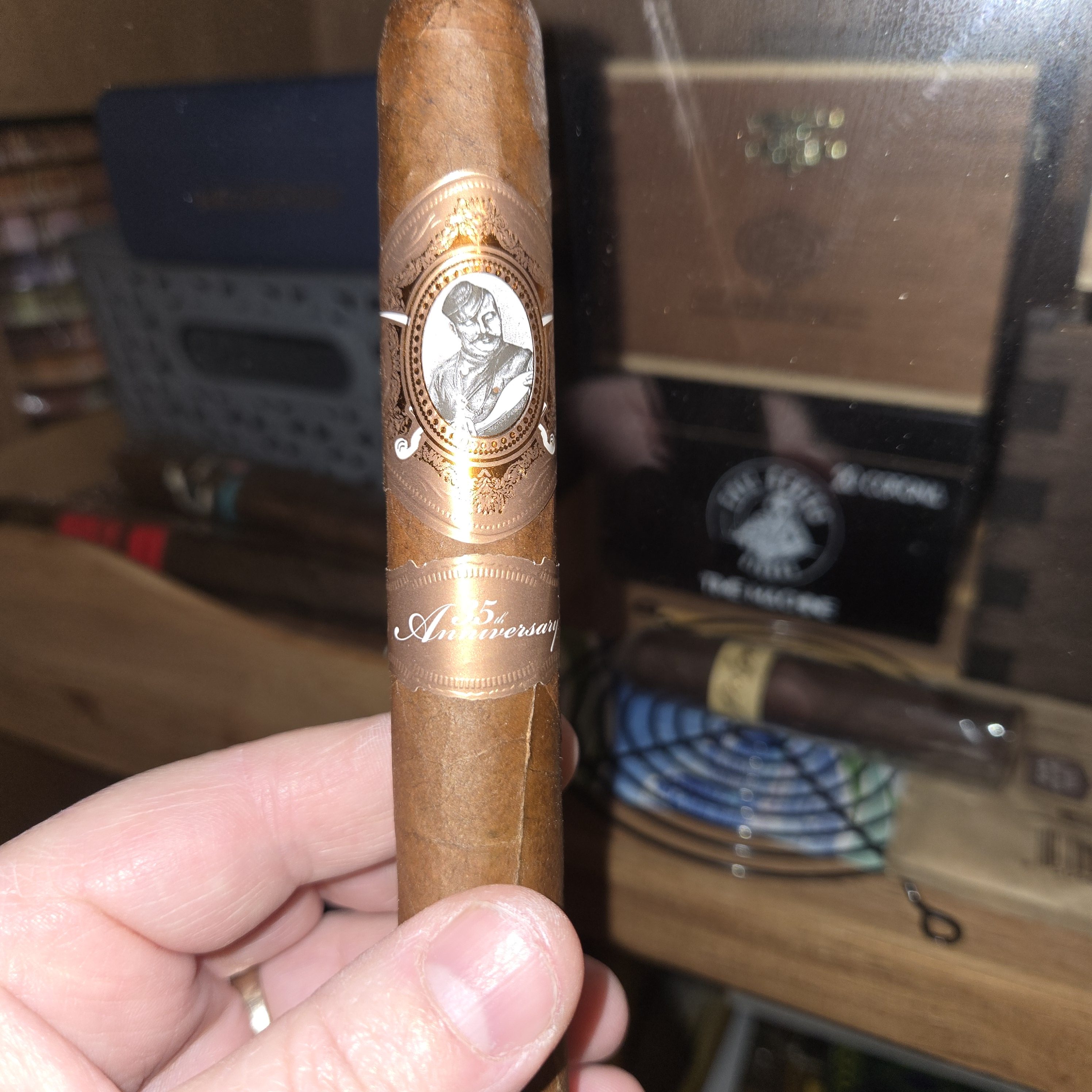 The Gurkha 35th Anniversary cigar follows the Gurkha Treinta in the company's anniversary series, being introduced in 2023 in order to celebrate the milestone occasion. Rolled in the DR, the cigars feature an Ecuadorian Habano wrapper, an Indonesian binder, and fillers from Nicaragua that includes Criollo '98 tobacco from Estelí. The cigars originally launched with 150-count humidors, but were later sold in 10-count boxes for each of the three sizes.