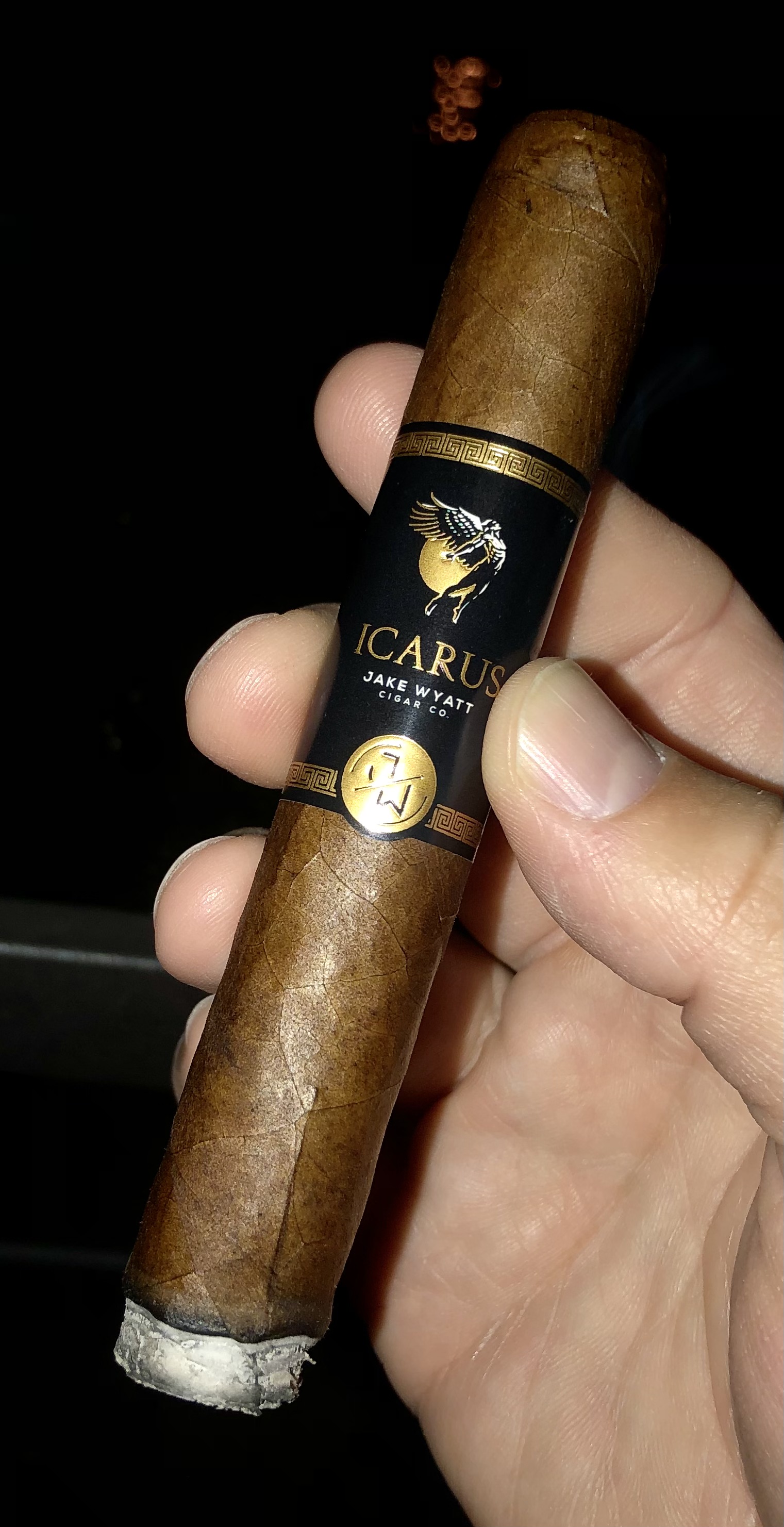 The Icarus cigar from Jake Wyatt takes its name from Greek mythology (the son of the master inventor Daedalus), being a figure who flew too close to the sun, causing the wax holding his makeshift wings to melt—resulting in his death. The sun's fiery aspect is found in the cigar's blend through the use of Tennessee fire-cured tobacco within the filler, being joined by Criollo '98, Piloto Cubano, and Pennsylvania Broadleaf. This core recipe is bound in Dominican Olor and finalized with a Mexican San Andrés maduro wrapper.