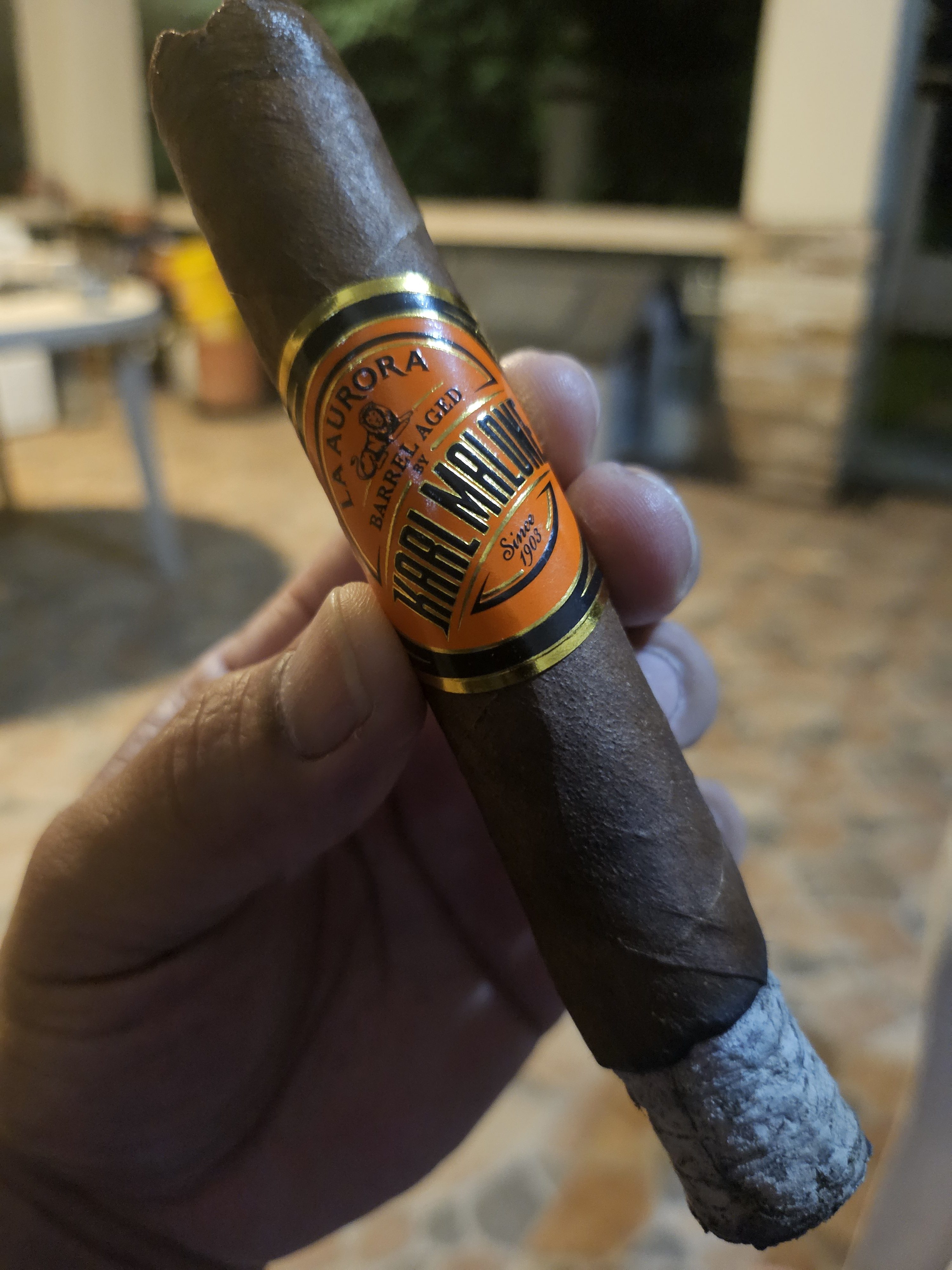The Barrel Aged by Karl Malone cigar debuted in 2018, being a collaboration between former NBA player Karl Malone and La Aurora. The blend features Ecuadorian wrapper and binder, with diverse fillers coming from Peru, Nicaragua, and the Dominican Republic. Additionally, the tobaccos within the blend are aged for six years before spending six months in spent rum barrels (the latter including all leaves except the wrapper component).