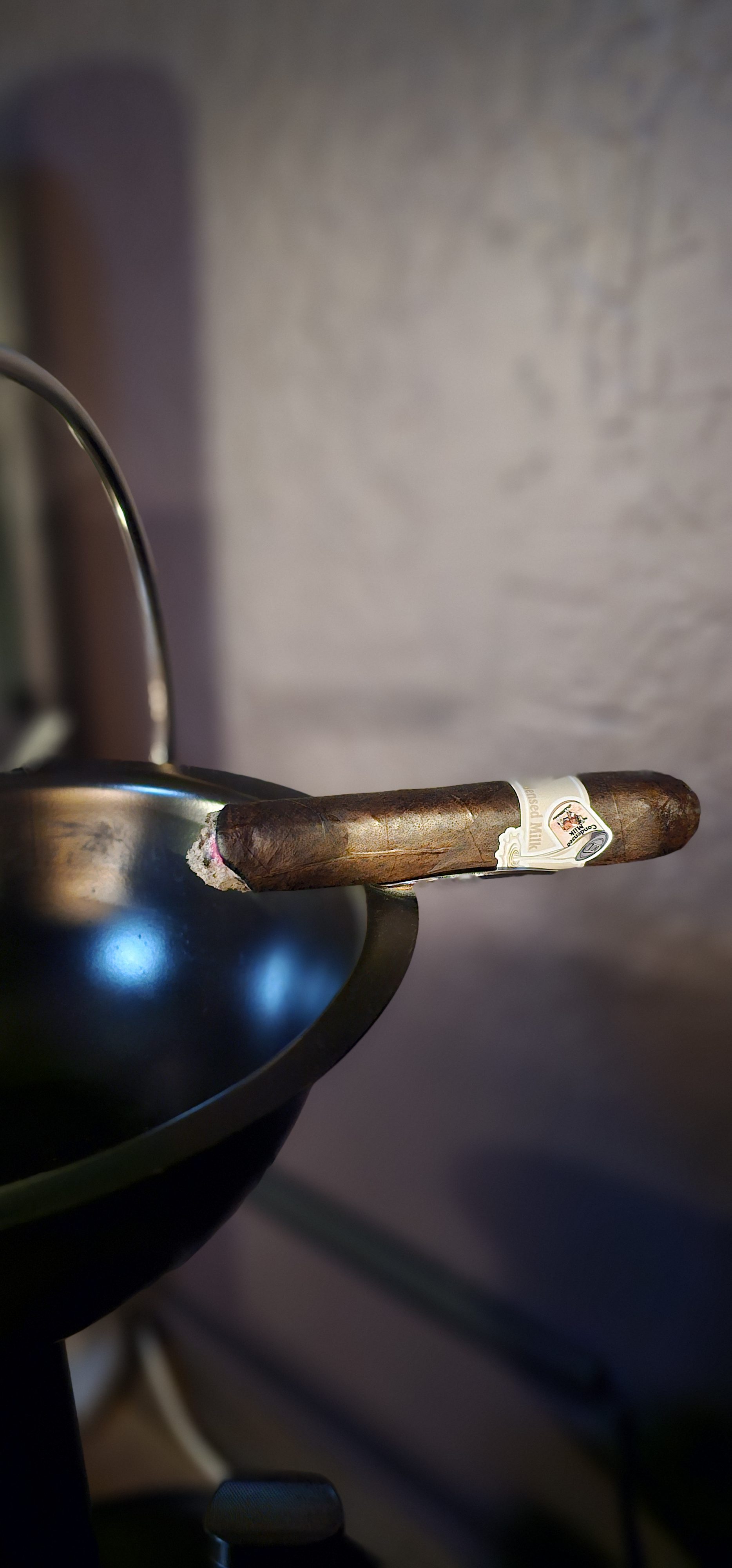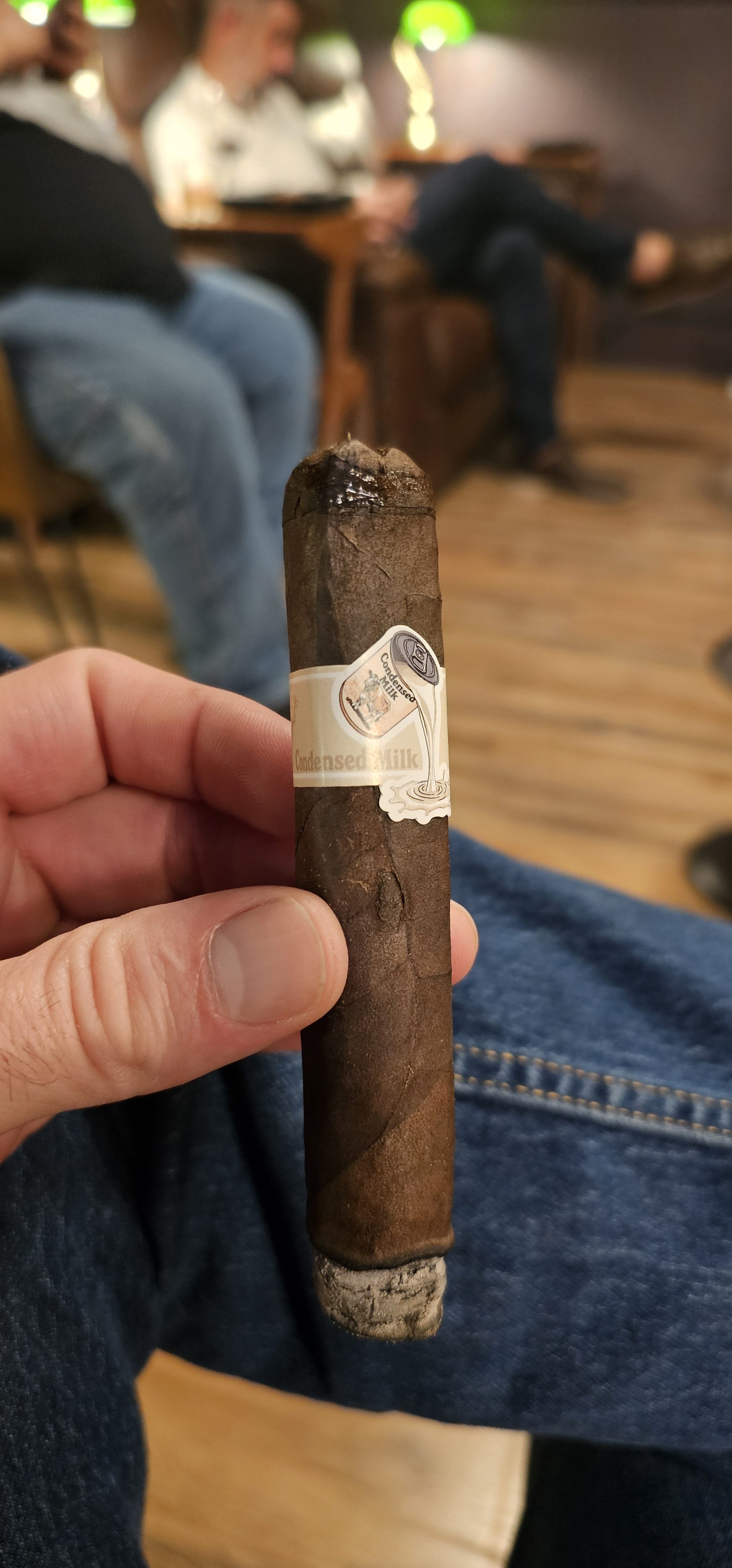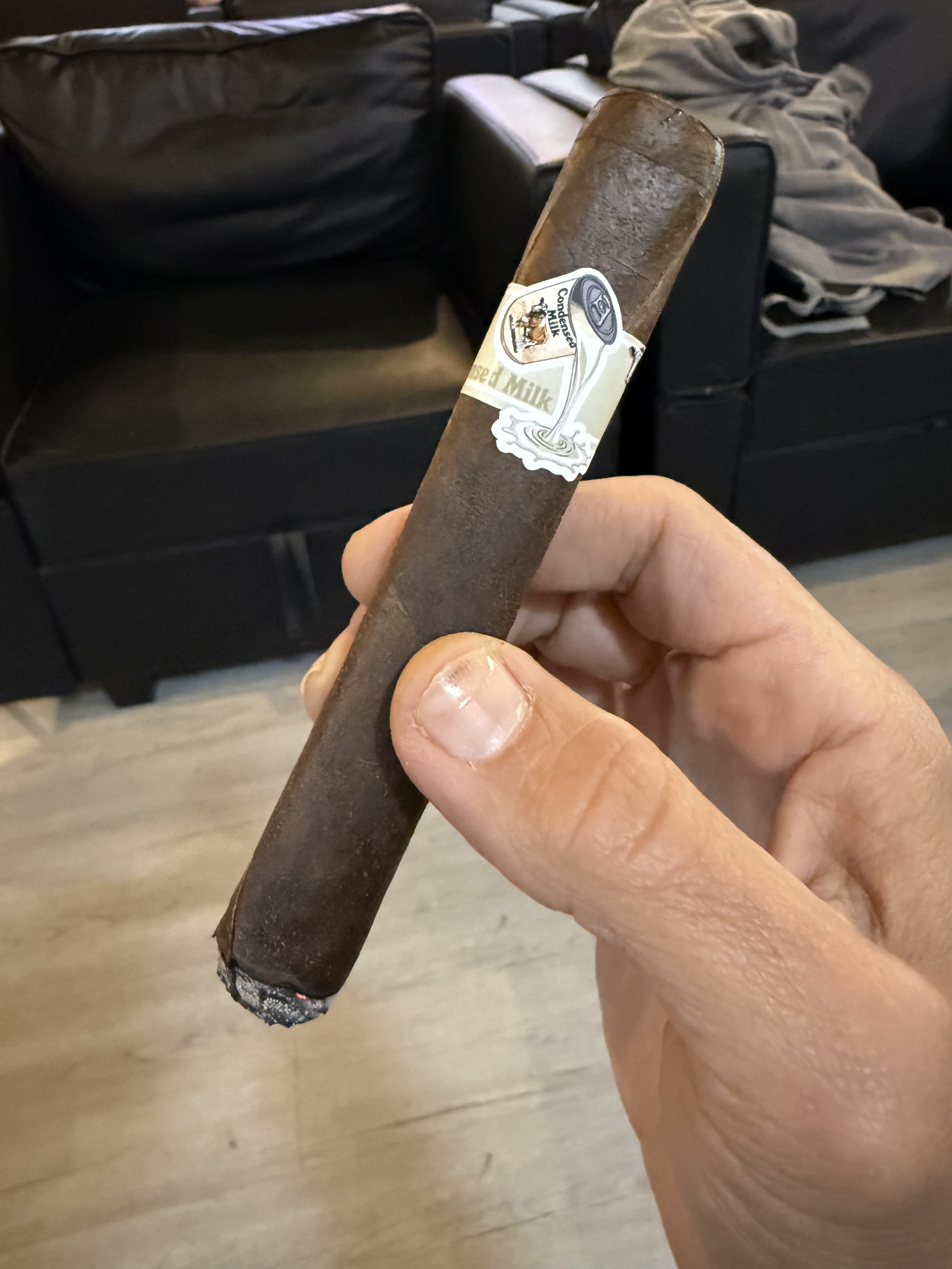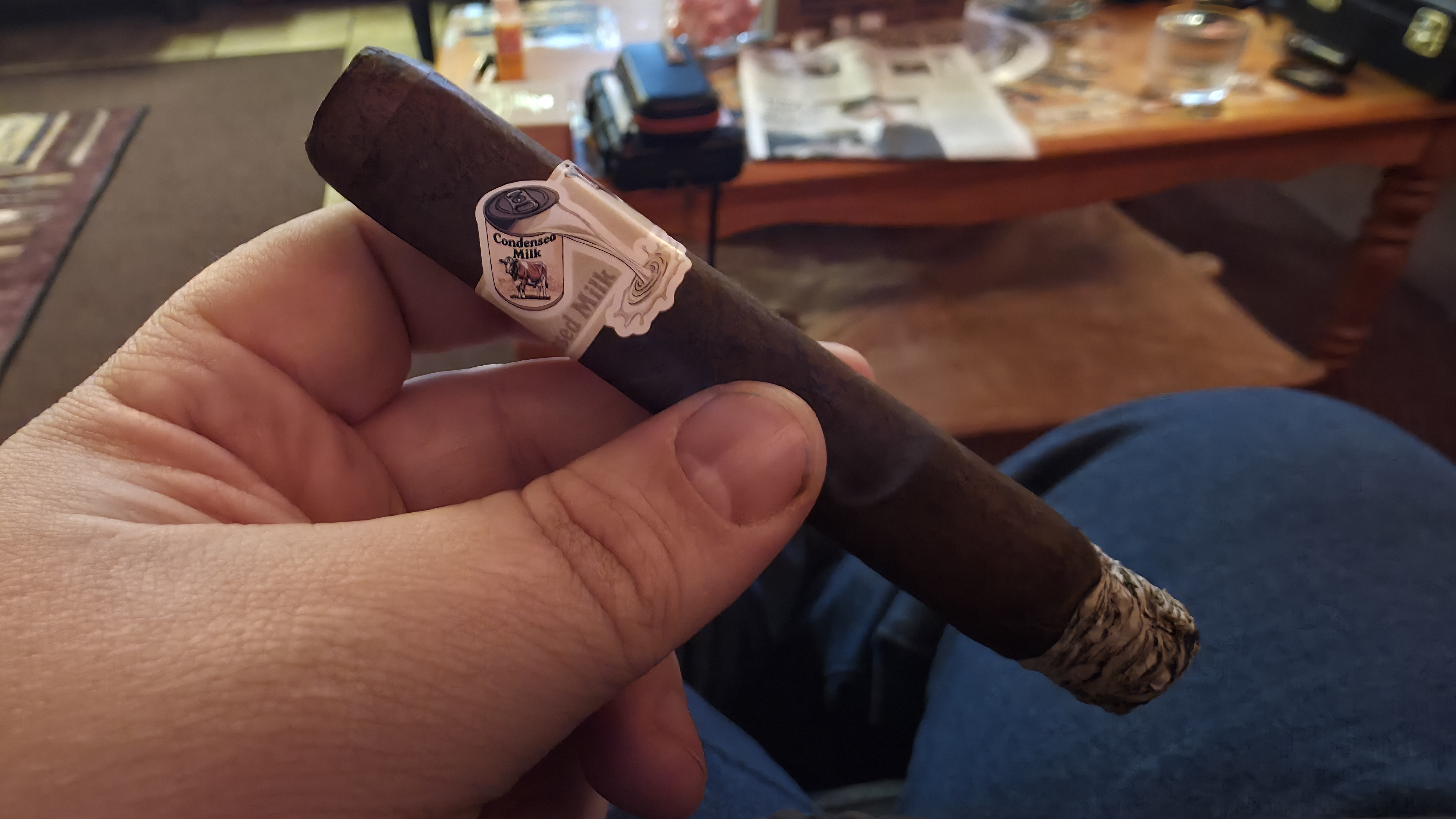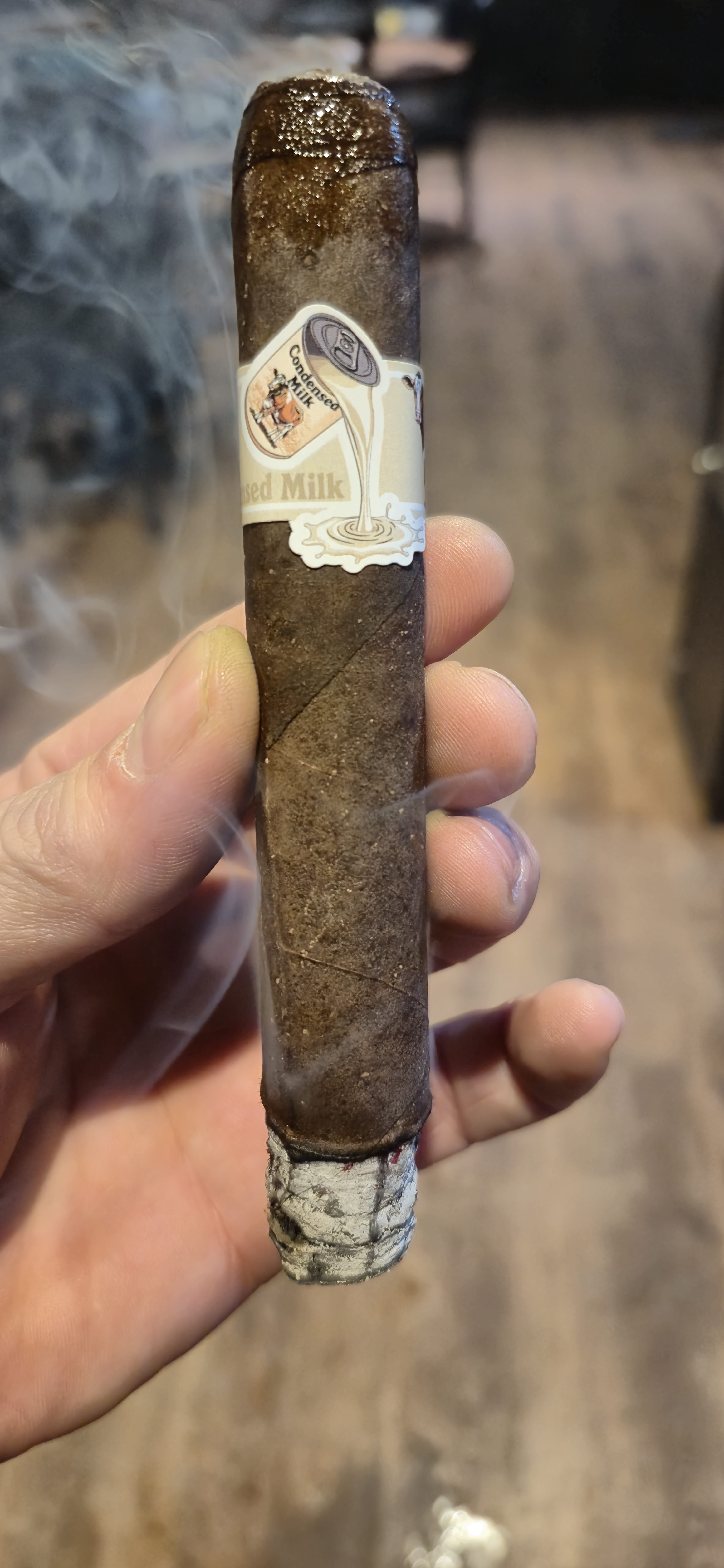 The Condensed Milk cigar from the Limited Cigar Association was rolled in a 5½" x 54 size, featuring a Mexican San Andrés negro maduro wrapper, a Nicaraguan binder from Jalapa, and fillers from Estelí (Nicaragua) and the Dominican Republic.