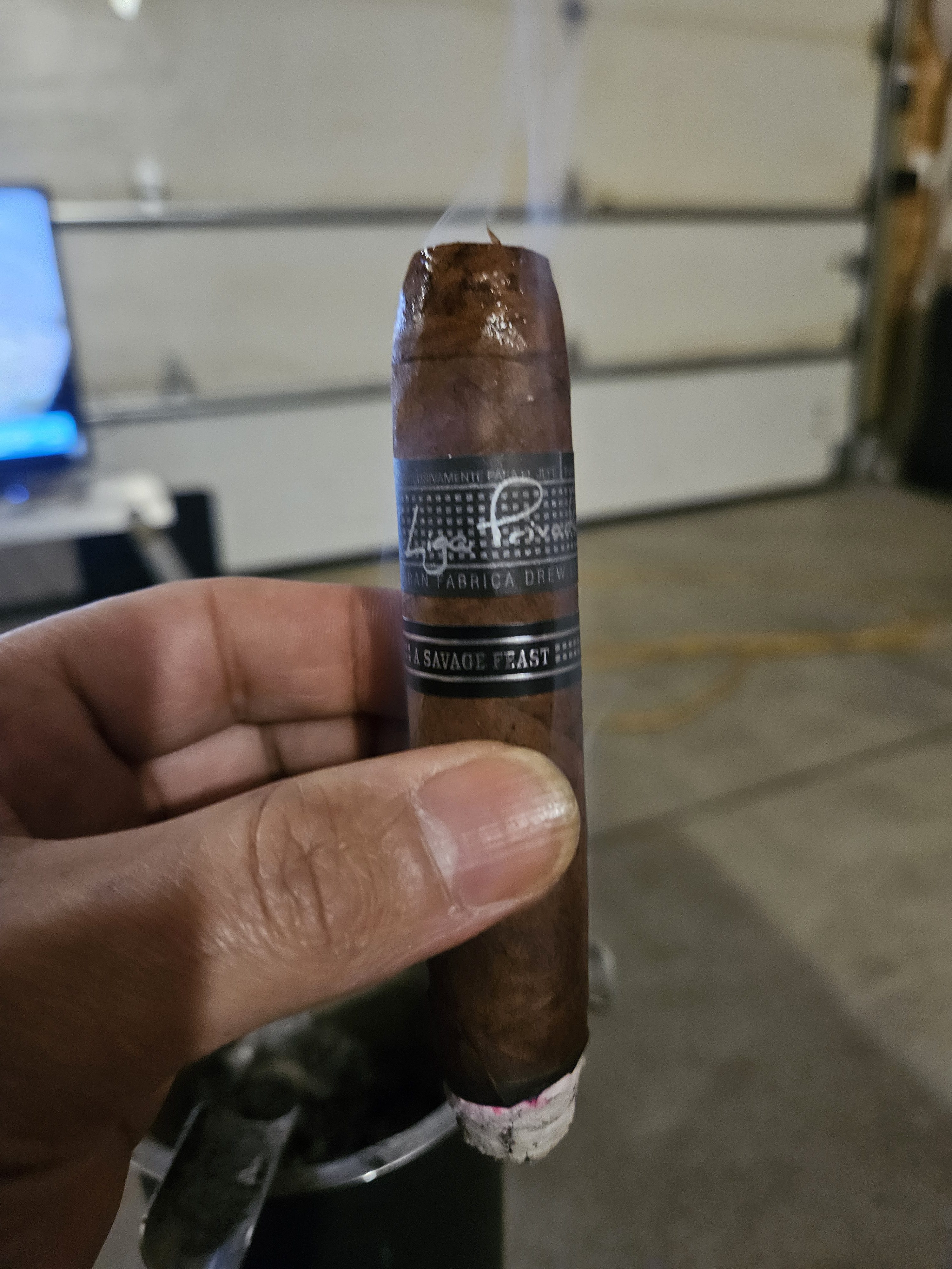 Drew Estate's Liga Privada 10-Year Aniversario A Savage Feast cigar is a limited extension of the Liga Privada 10-Year Aniversario, originally made to celebrate the 10th anniversary of Liga Privada cigars. With the event-exclusive A Savage Feast size, the cigar is rolled in a 5⅜" x 60 perfecto that is similar to the Feral Flying Pig cigar. The blend remains the same, featuring a hybrid Connecticut-grown Criollo wrapper, a Mexican San Andrés Otapan Negro Último Corte binder, and fillers from Nicaragua and Pennsylvania (Green River One Sucker ligero).