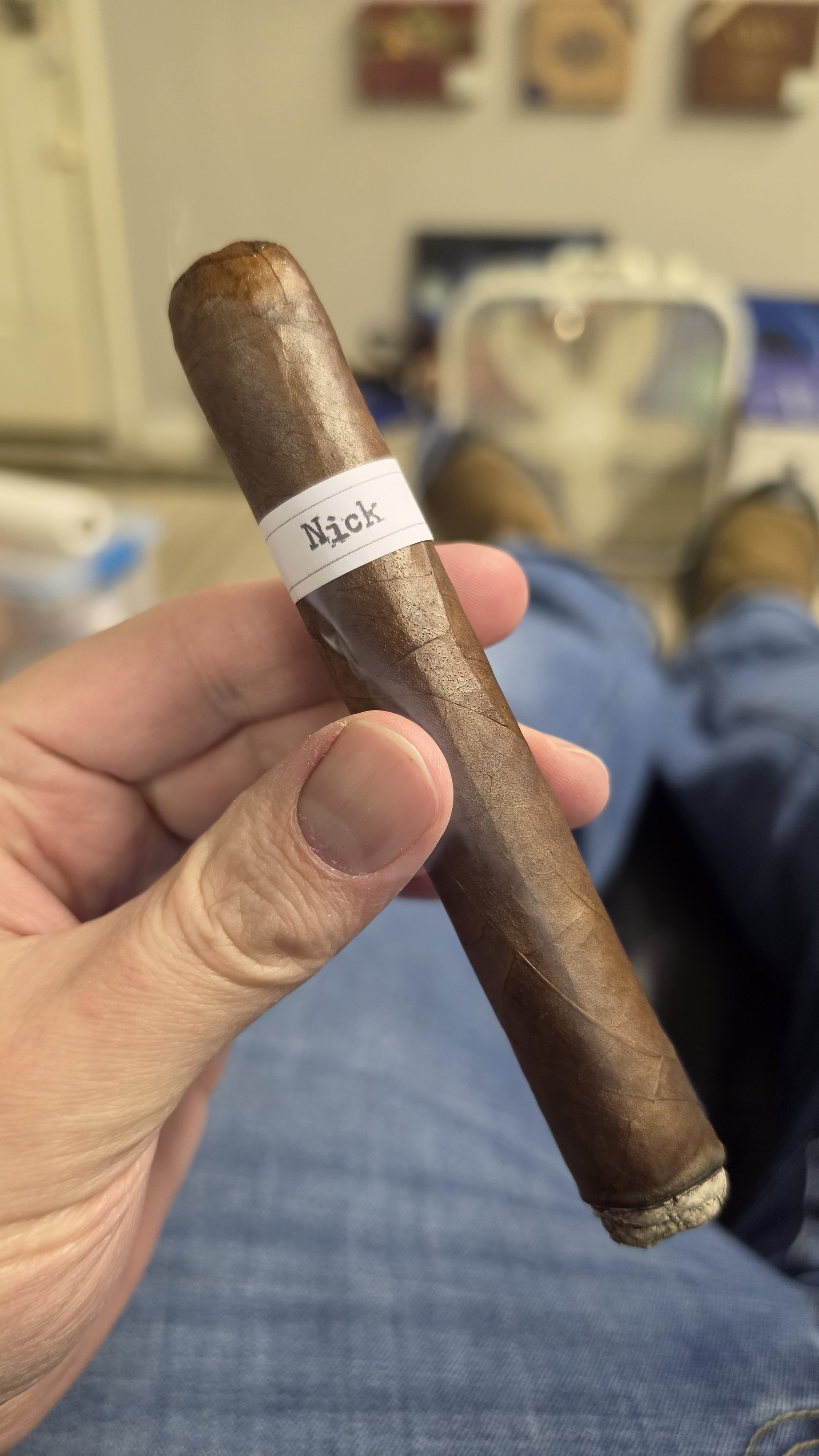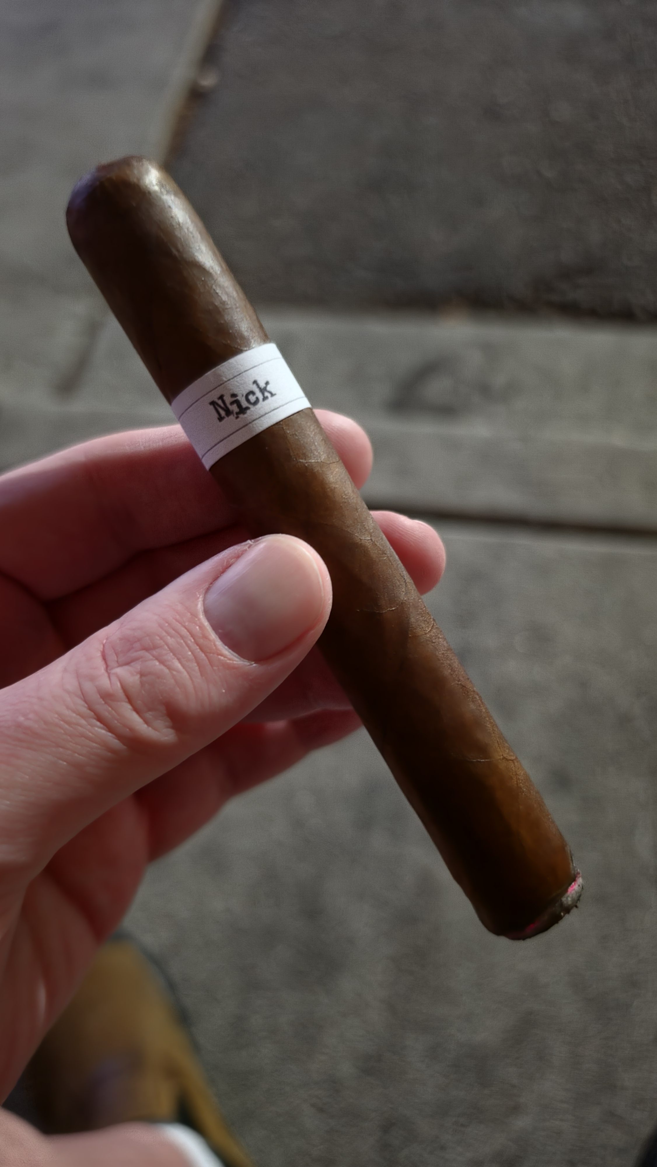 The Nick cigar was a spinoff of the former Nick & Jim cigar, a collaboration between Nick Syris and “Island” Jim Robinson. The Nick features a similar blend, including an Ecuadorian Vuelta Abajo wrapper, a Nicaraguan binder, and fillers of Peruvian, Brazilian Mata Fina, Nicaraguan, and Ecuadorian tobaccos.