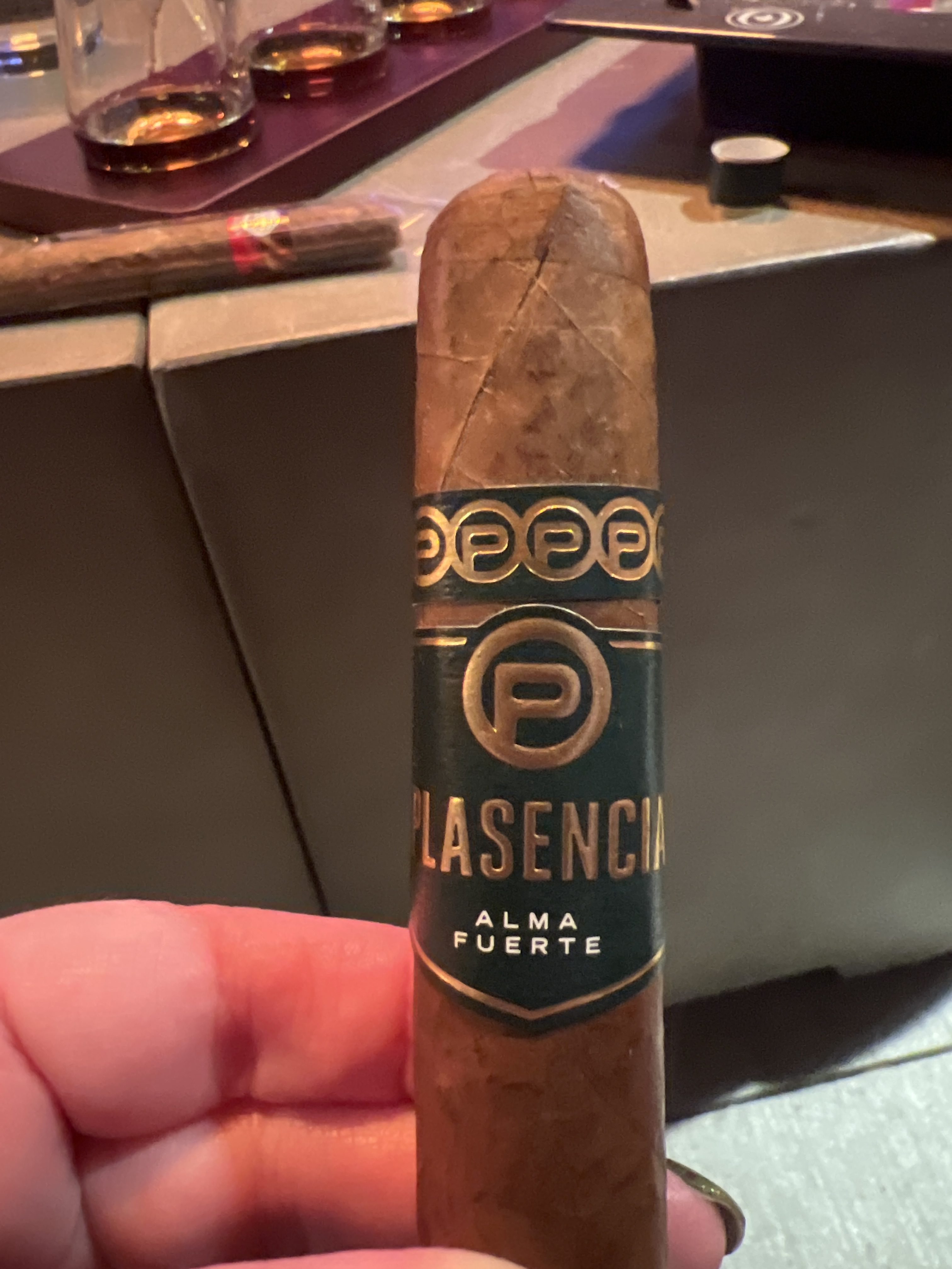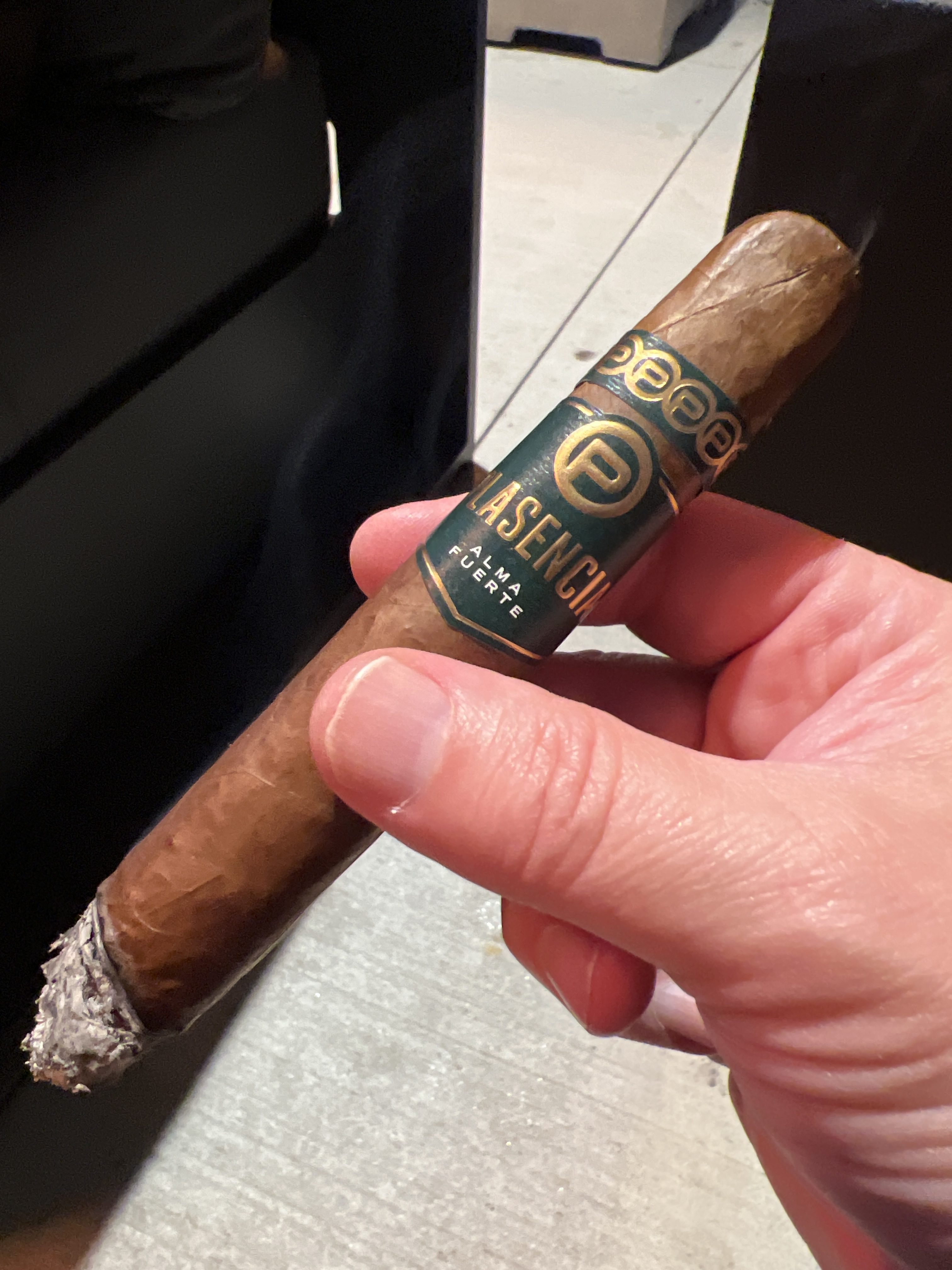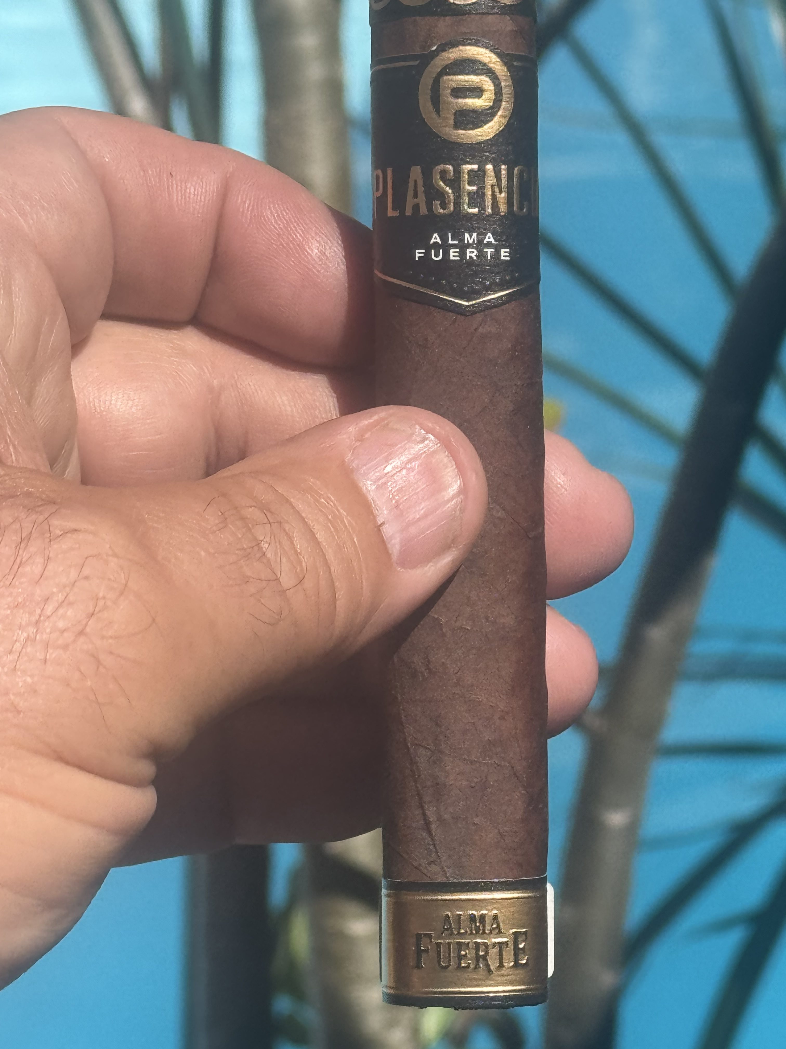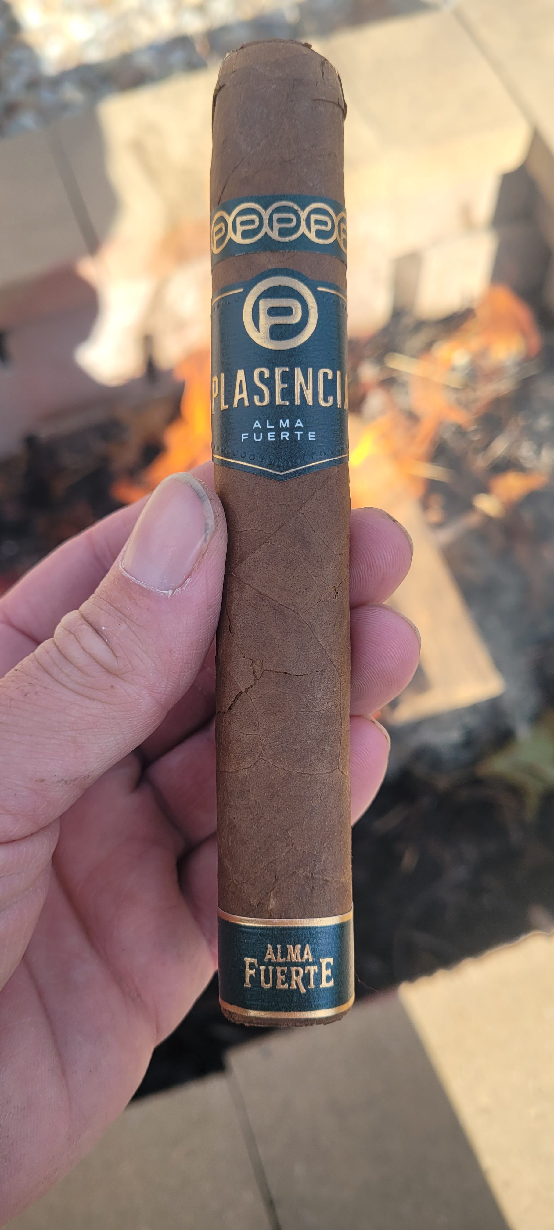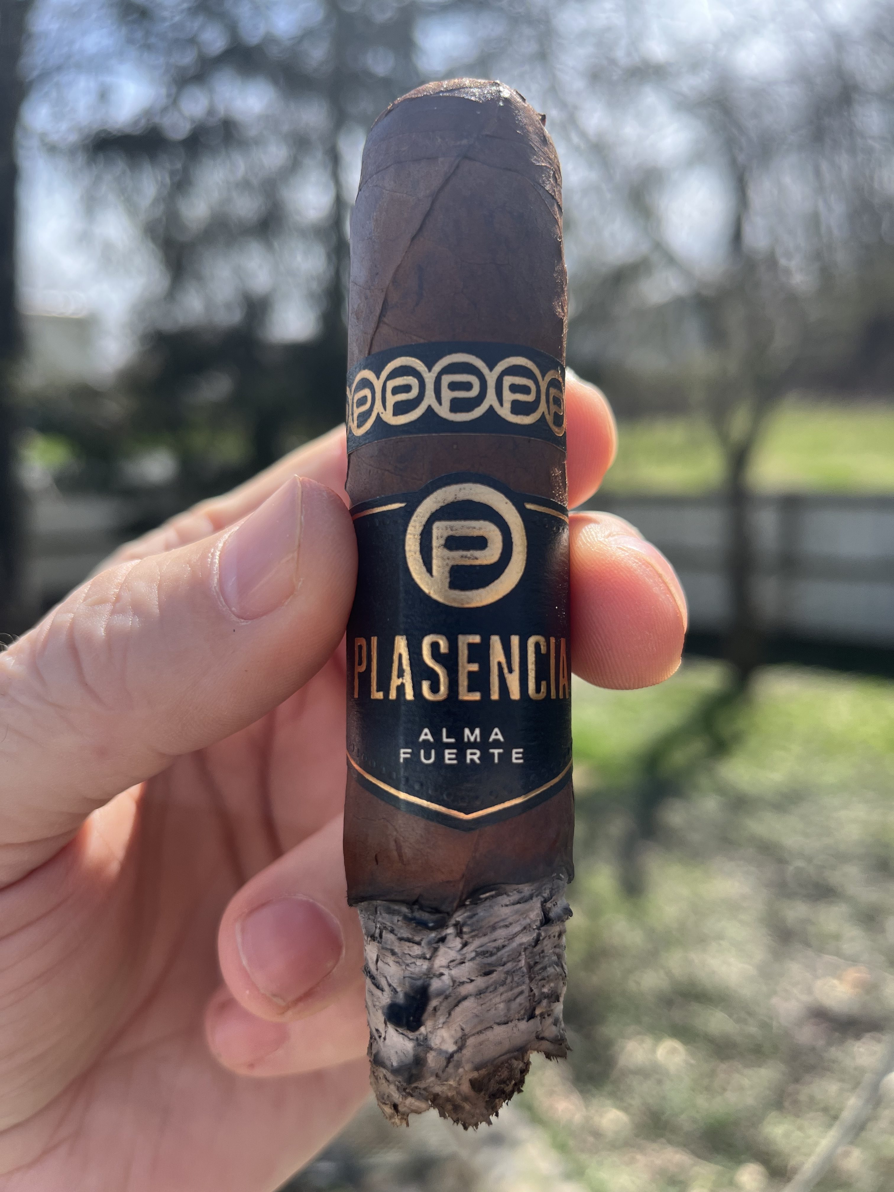 PLASENCIA ALMA FUERTE. Look and feel says top shelf. hexagon box press and weight are impressive. intriguing wrapper dark w/ one odd seam, see how it effects the bun. draw starts tight. first third very cool, leather, raisin. retro is floral. Strong ash is gray yellow holds the full third. Smoke is white. Draw could loosen a bit. Second third, very consistent deep creamy leather. Retro becomes a pleasant pepper adding depth. I like a little more smoke output. Last third hints of pretzel bun, very nice, very pleasant, all around balanced. seam did fluster the warped a tad. kind a disappointing for the price. gabbing two more on way out. highly recommended