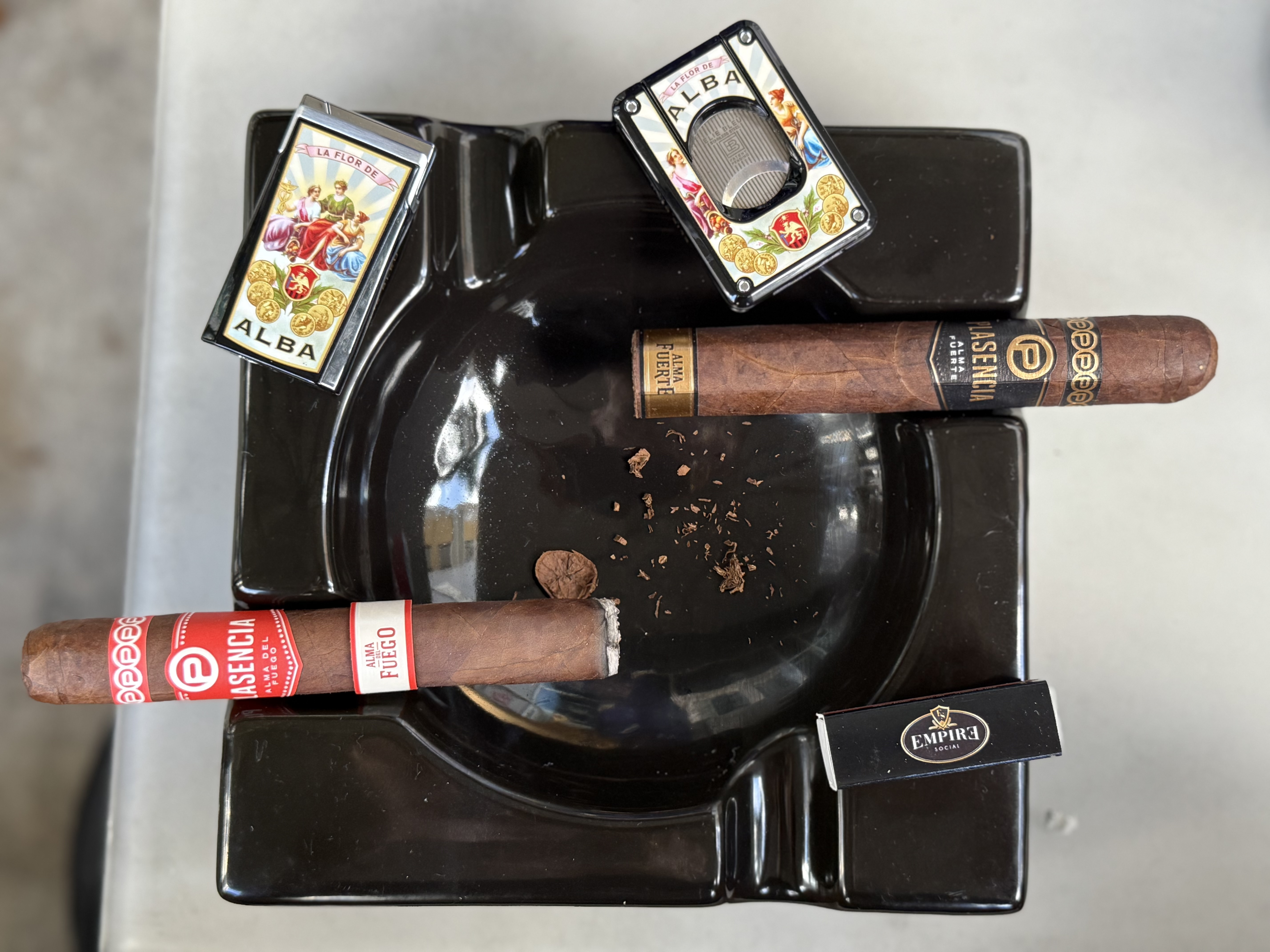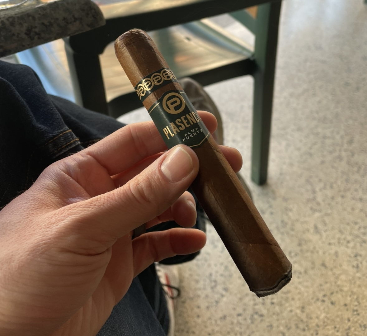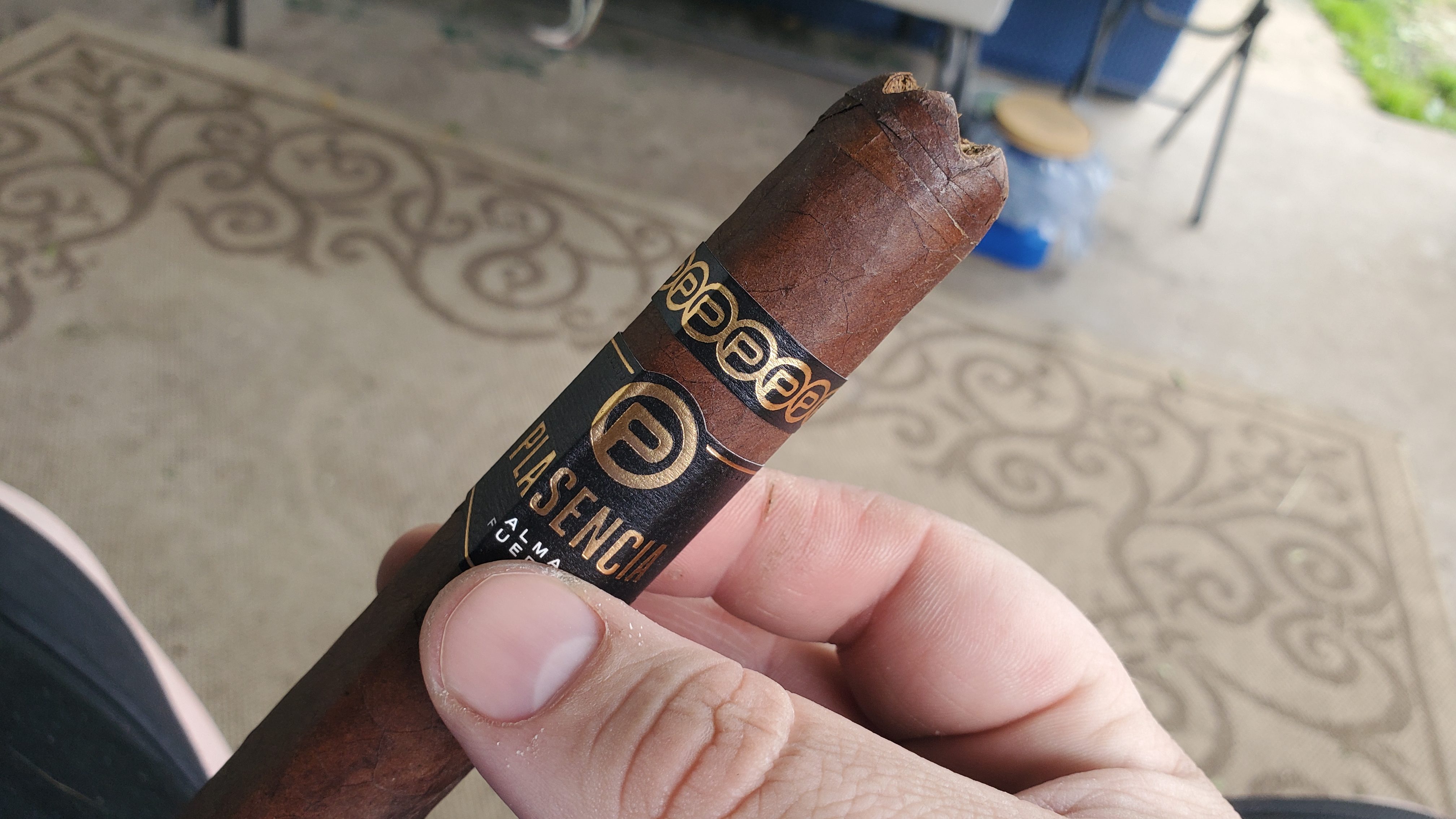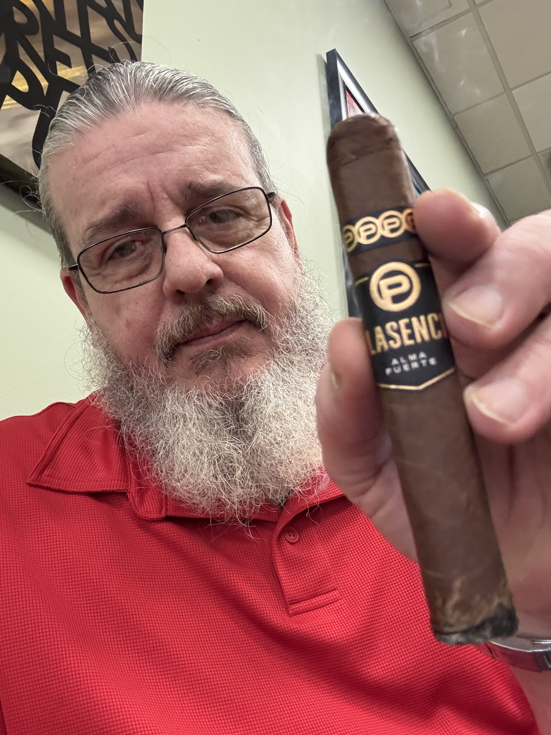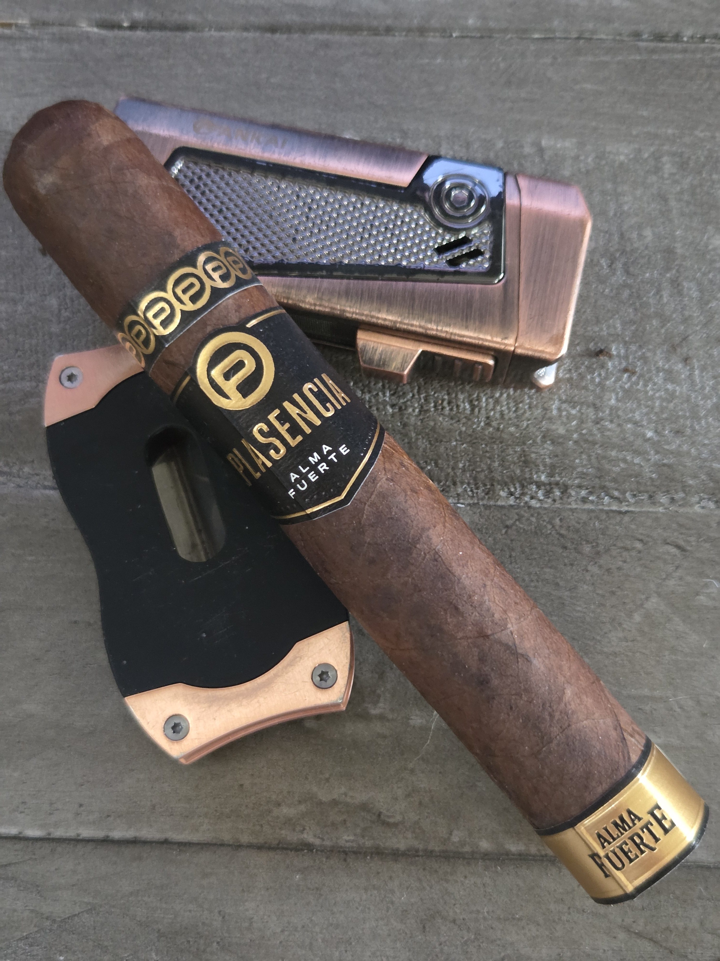PLASENCIA ALMA FUERTE. Look and feel says top shelf. hexagon box press and weight are impressive. intriguing wrapper dark w/ one odd seam, see how it effects the bun. draw starts tight. first third very cool, leather, raisin. retro is floral. Strong ash is gray yellow holds the full third. Smoke is white. Draw could loosen a bit. Second third, very consistent deep creamy leather. Retro becomes a pleasant pepper adding depth. I like a little more smoke output. Last third hints of pretzel bun, very nice, very pleasant, all around balanced. seam did fluster the warped a tad. kind a disappointing for the price. gabbing two more on way out. highly recommended