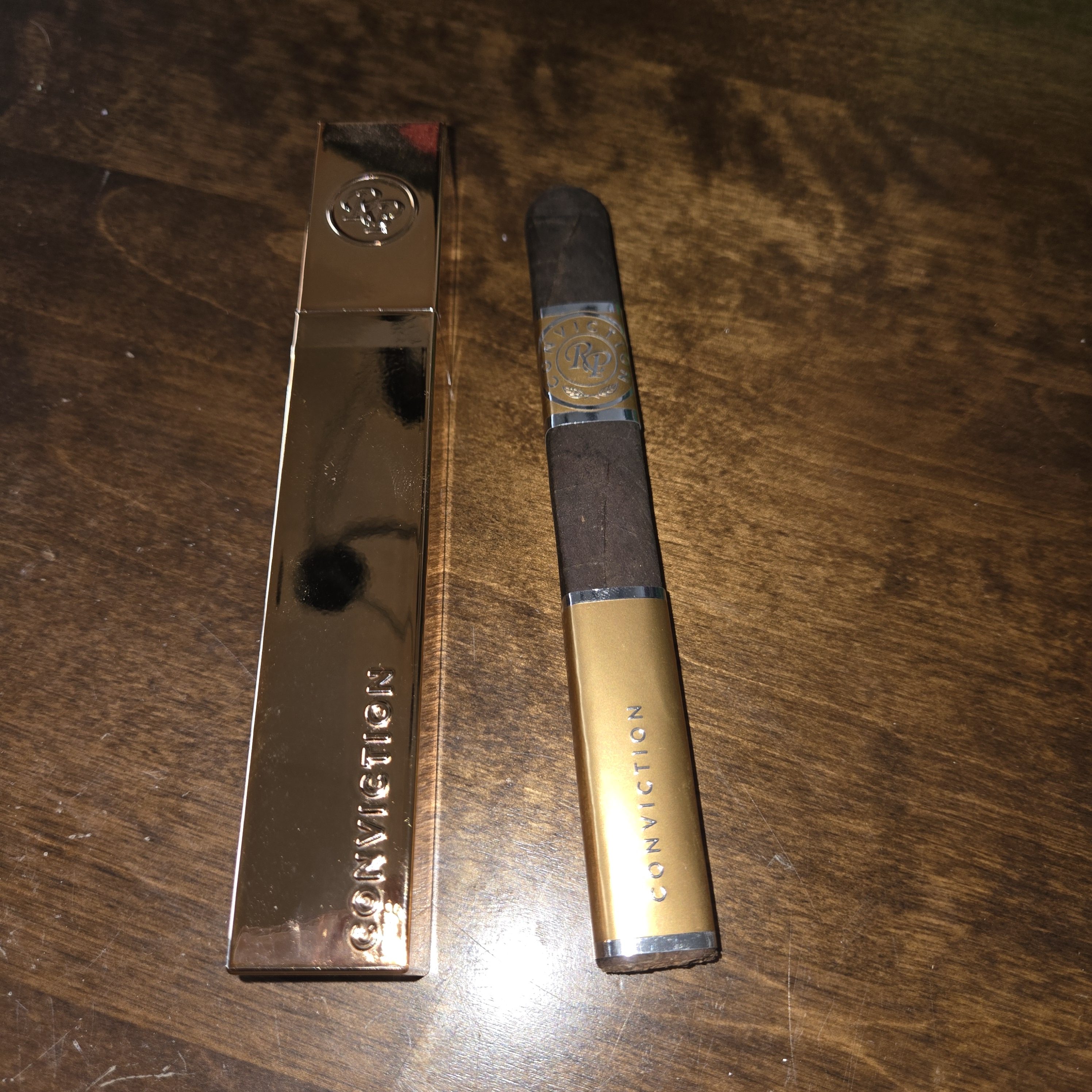 The Conviction is the most expensive cigar ever rolled by Rocky Patel, debuting in 2023 at $100. Justifying the cost, Rocky has entrusted only four rollers out of the company's TAVICUSA factory in Estelí, Nicaragua, limiting production to 250 cigars per day per pair. The cigars were crafted primarily from a 2014 harvest from the company's own farms throughout Nicaragua's Condega and Estelí growing regions, used throughout the filler and double binder. Additionally, the leaves were tercio-aged for four years, being tightly bundled in royal palm leaves. This recipe is finalized with a Mexican San Andrés wrapper, being rolled in a 6½" x 52 box-pressed toro format. The finished cigars are individually packaged in metallic, rectangular tubos, being packaged 10 to a box, with the boxes themselves doubling as functioning humidors. The Conviction cigar was limited to a total production of 50,000 cigars.