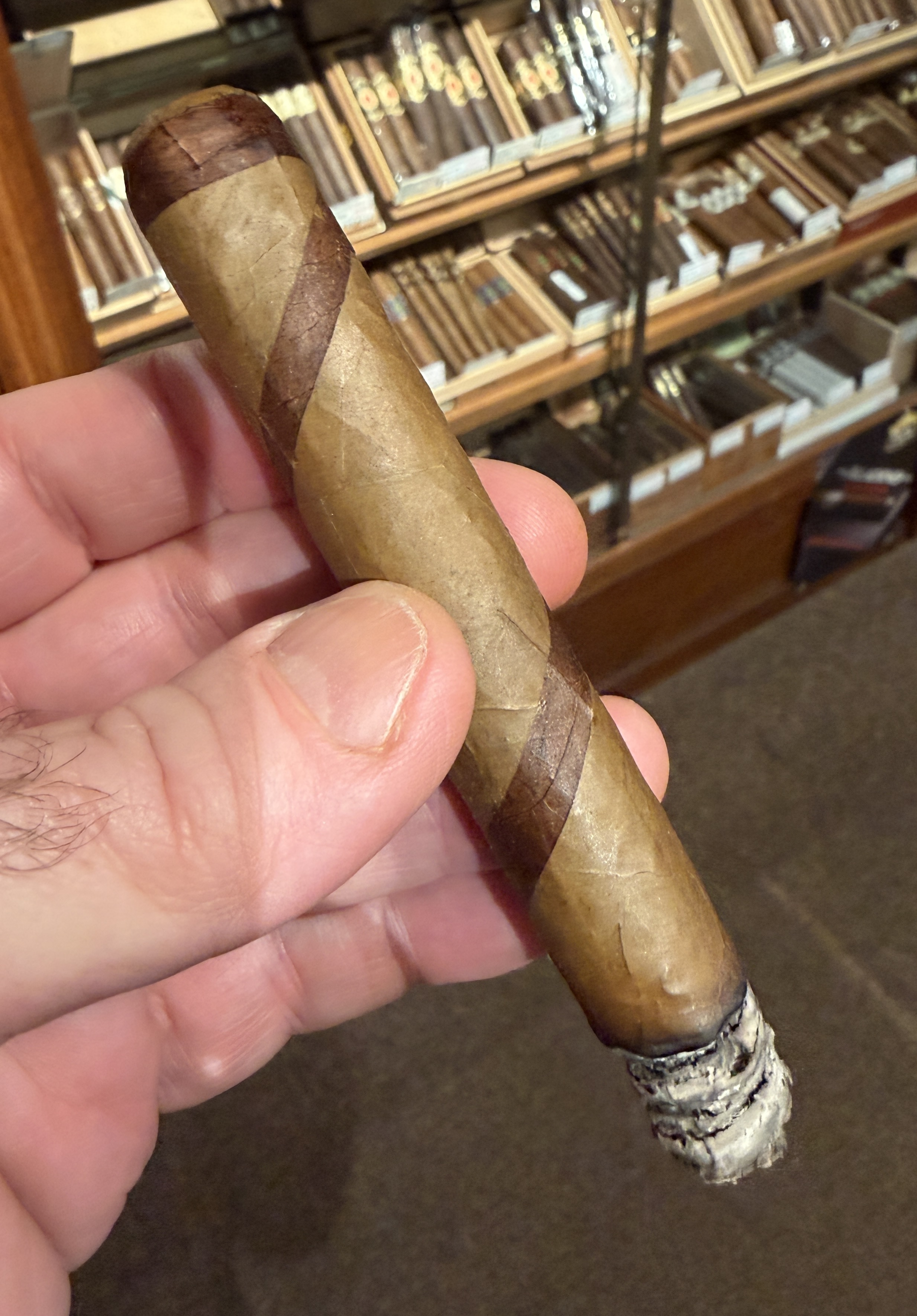 Really nice stick, barber pole is subtle and classy. Solid medium bodied smoke, lot’s of toasted nuts, roasted coffee, dark fruit, fresh leather.