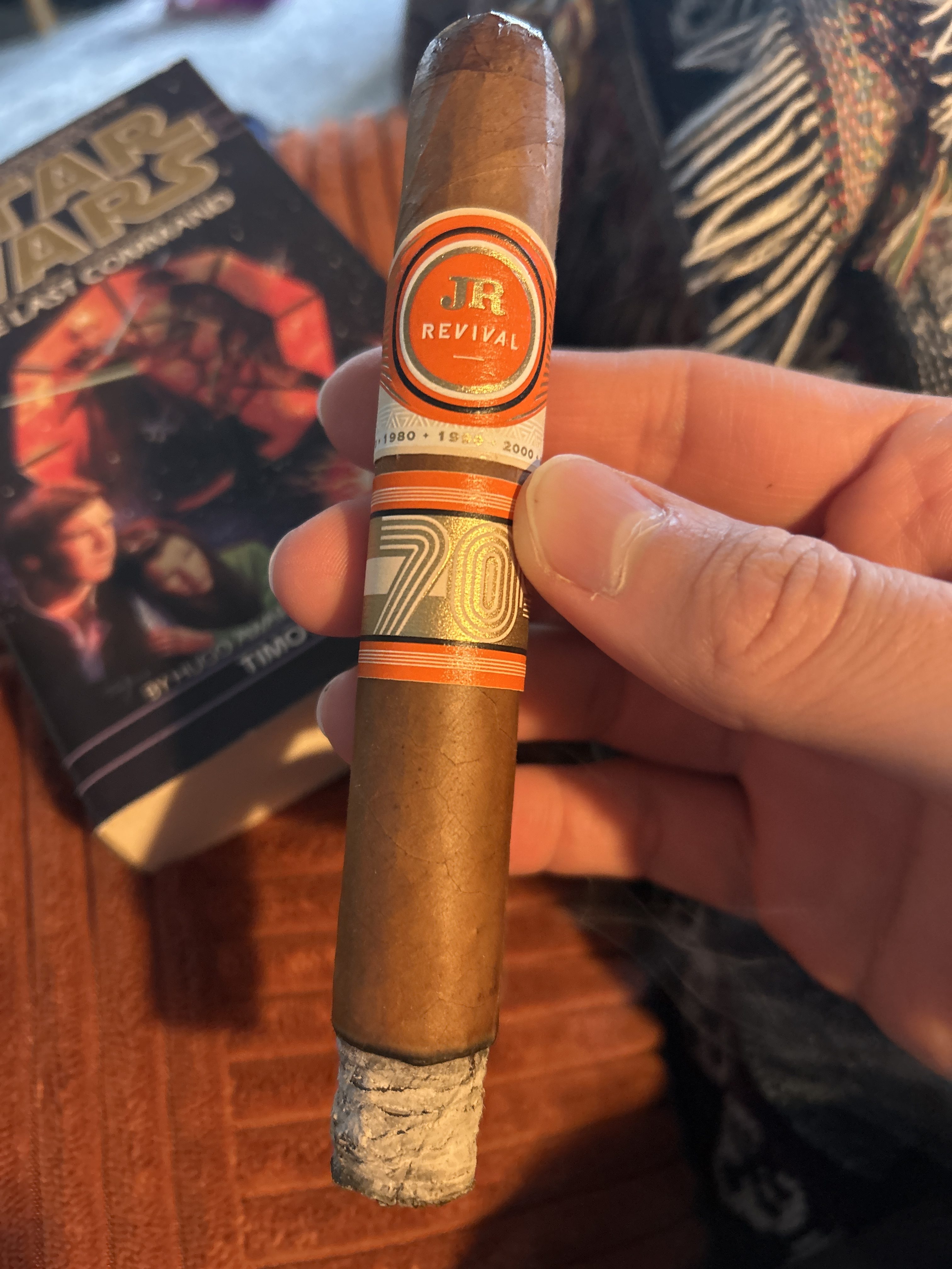 Cal is smoking JR Revival 70s. Rated with thumbs up!